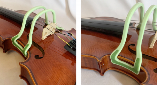 バイオリン本体に取り付け、ガイドに沿って弓を動かしながら演奏することで、